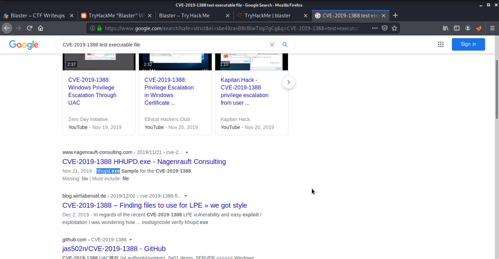 #1 Viewing the browsing history identified CVE-2019-1388 as the CVE researched on the system.