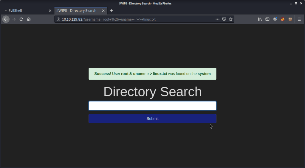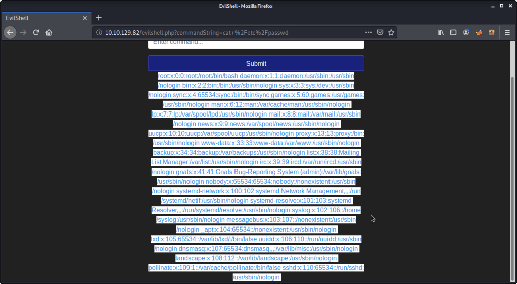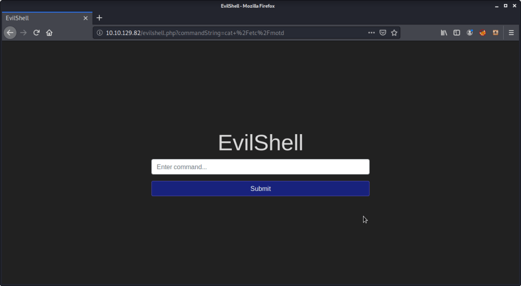This task gives an explanation about active command injection. To complete the questions/subtasks, navigate to http://MACHINE_IP/evilshell.php (where MACHINE_IP is the IP from task 1)