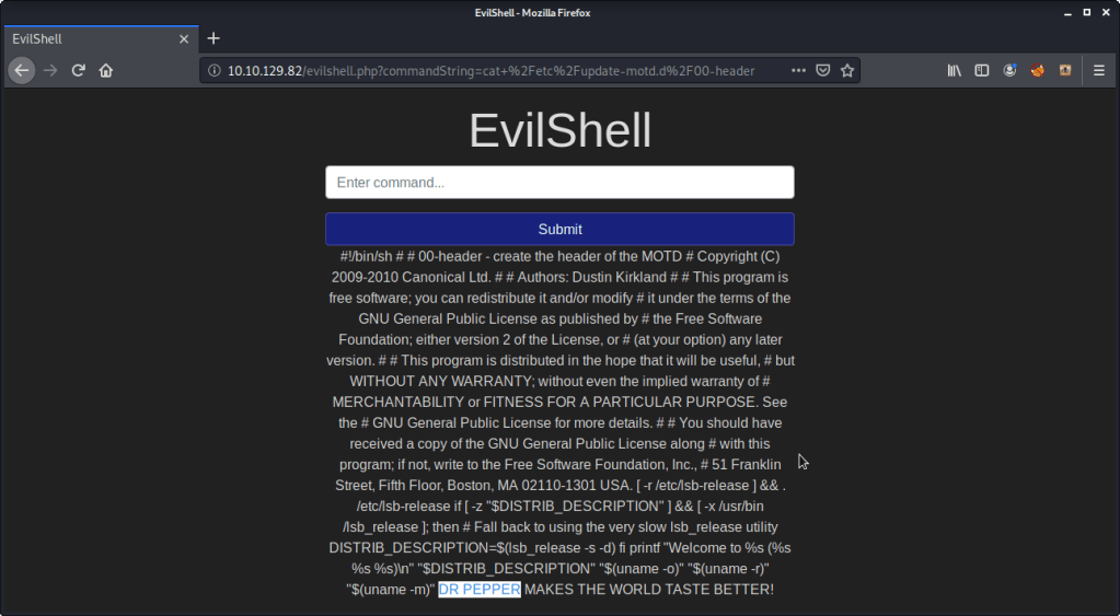 - Read contents of file “00-header” to complete subtask. “DR PEPPER” was the beverage name in the MOTD.