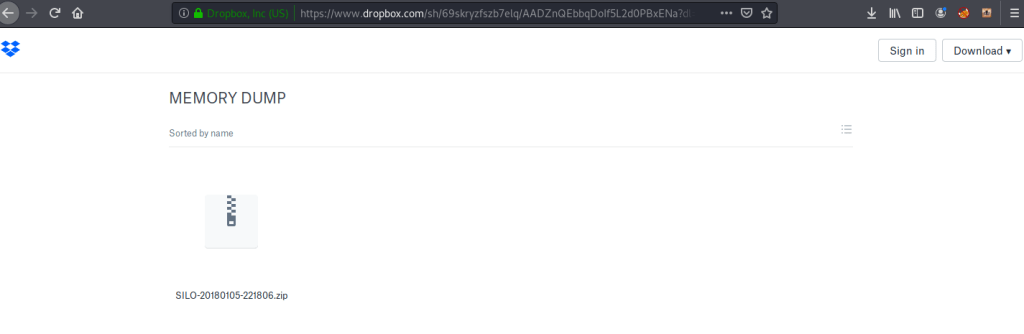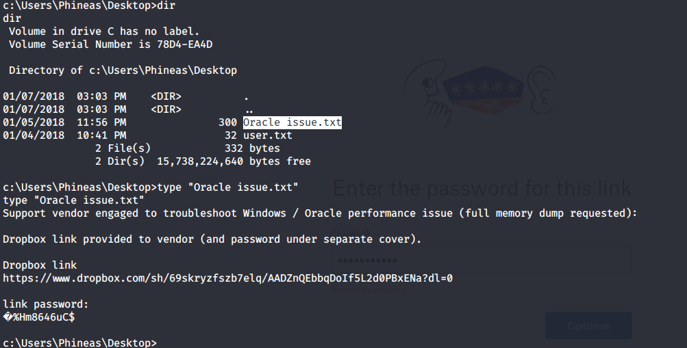 Apart from user flag file, there was another interesting file “Oracle issue.txt” in the Desktop folder of user Phineas. Read the contents of the file and it was referring to full memory dump requested by vendor to troubleshoot Windows/Oracle performance issues. The file contained link to dropbox having the memory dump and surprisingly password for the dump file as well.