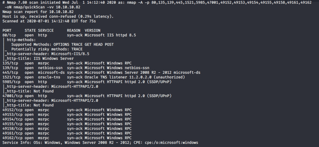 Scan results showed quite a few open ports including http(80), RPC (135), SMB (139, 445) and Oracle TNS listener (1521). Tried anonymously connecting and listing SMB shares but access was denied. Then browsed to website as port 80 was detected open running “IIS 8.5”.