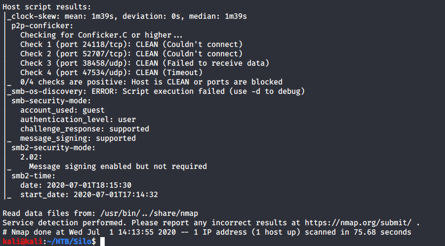 After connecting HTB lab through VPN, started Silo (10.10.10.82) machine. To check the available services, scanned the machine with nmap scanning all ports and doing a quick scan (nmap -T4 -p- 10.10.10.82). Used the identified open ports to perform an aggressive scan for script scanning, OS and service version detection as follows: