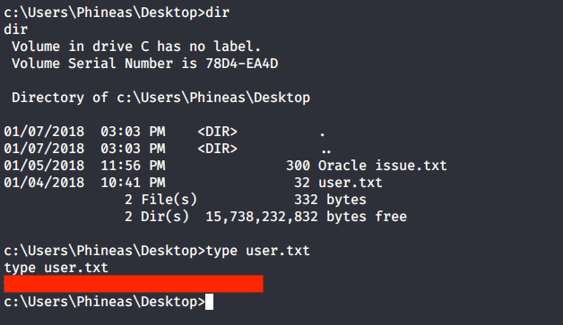 Obtained a shell to the system using “shell” meterpreter command. Browsed to “C:\Users” to know users available on system and moved to Phineas directory to look for user flag.