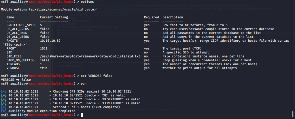 Alternately, SIDs can also be enumerated using Metasploit sid_brute auxiliary module (auxiliary/scanner/oracle/sid_brute).