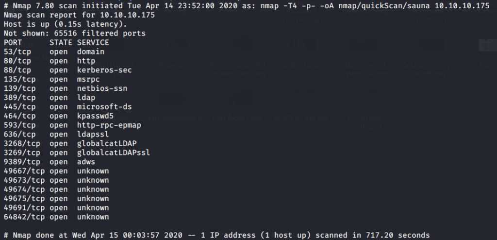 After connecting to HTB lab through VPN, started Sauna (10.10.10.175) box. To check the available services, I scanned the box with nmap scanning all ports and doing a quick scan as follows: