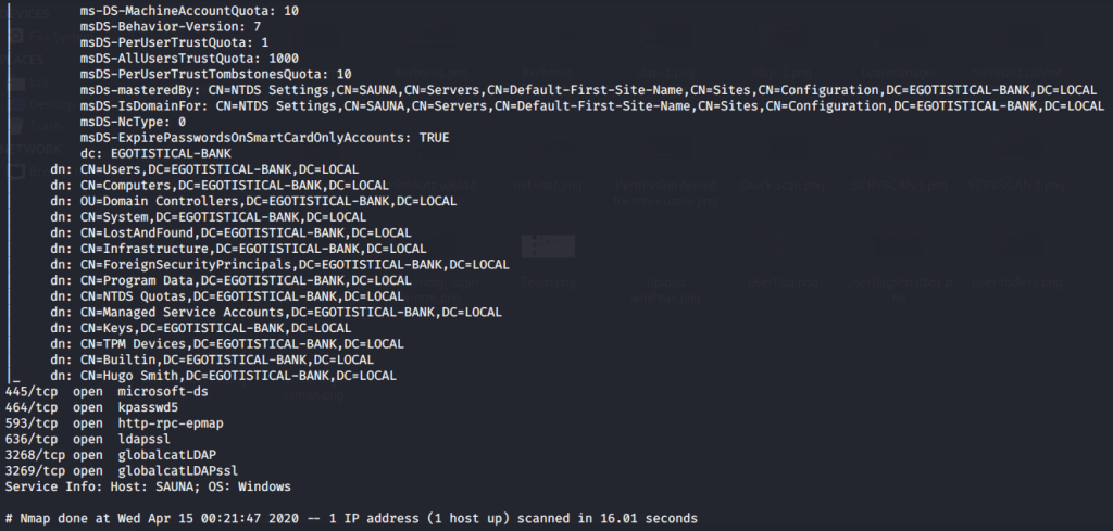 As ldap (active directory) was running on target, scanned the box with nmap ldap scripts that confirmed domain name as “EGOTISTICAL-BANK.LOCAL”.
